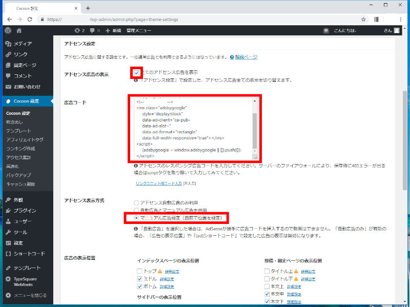 ⑤「アドセンス表示方式」は「マニュアル広告設定(自前で位置を設定)」にチェックを入れる