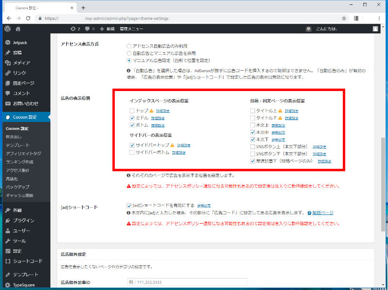 「Cocoon設定」から「広告」の欄でチェックを入れるだけで簡単に設定ができるので便利なのですが、