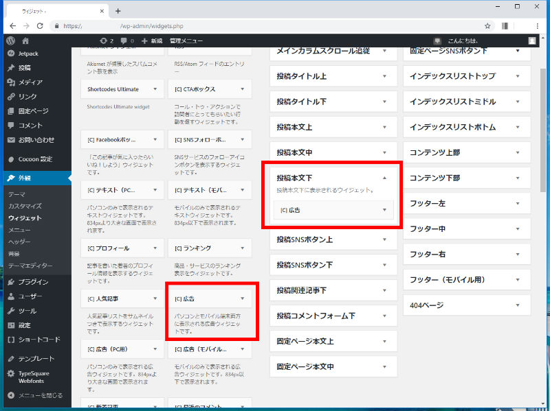 [C]広告を「本文記事下」にチェックを入れて→「ウィジェットを追加」